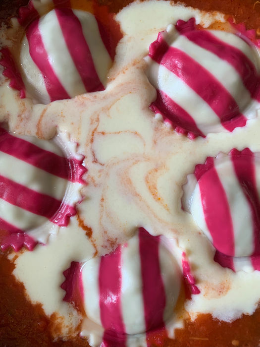 Comprei o raviole de mussarela de búfala acompanhado do molho pomodoro e o parmesão ralado🍅🧀10!
